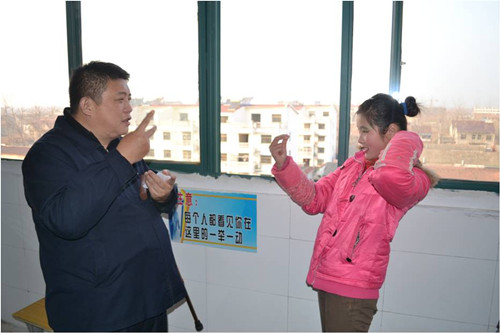 圖為李靜董事長(zhǎng)與聾啞人同學(xué)用手語交流