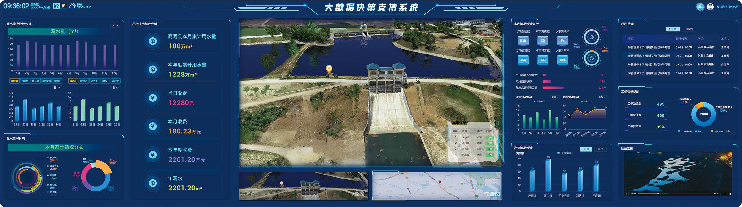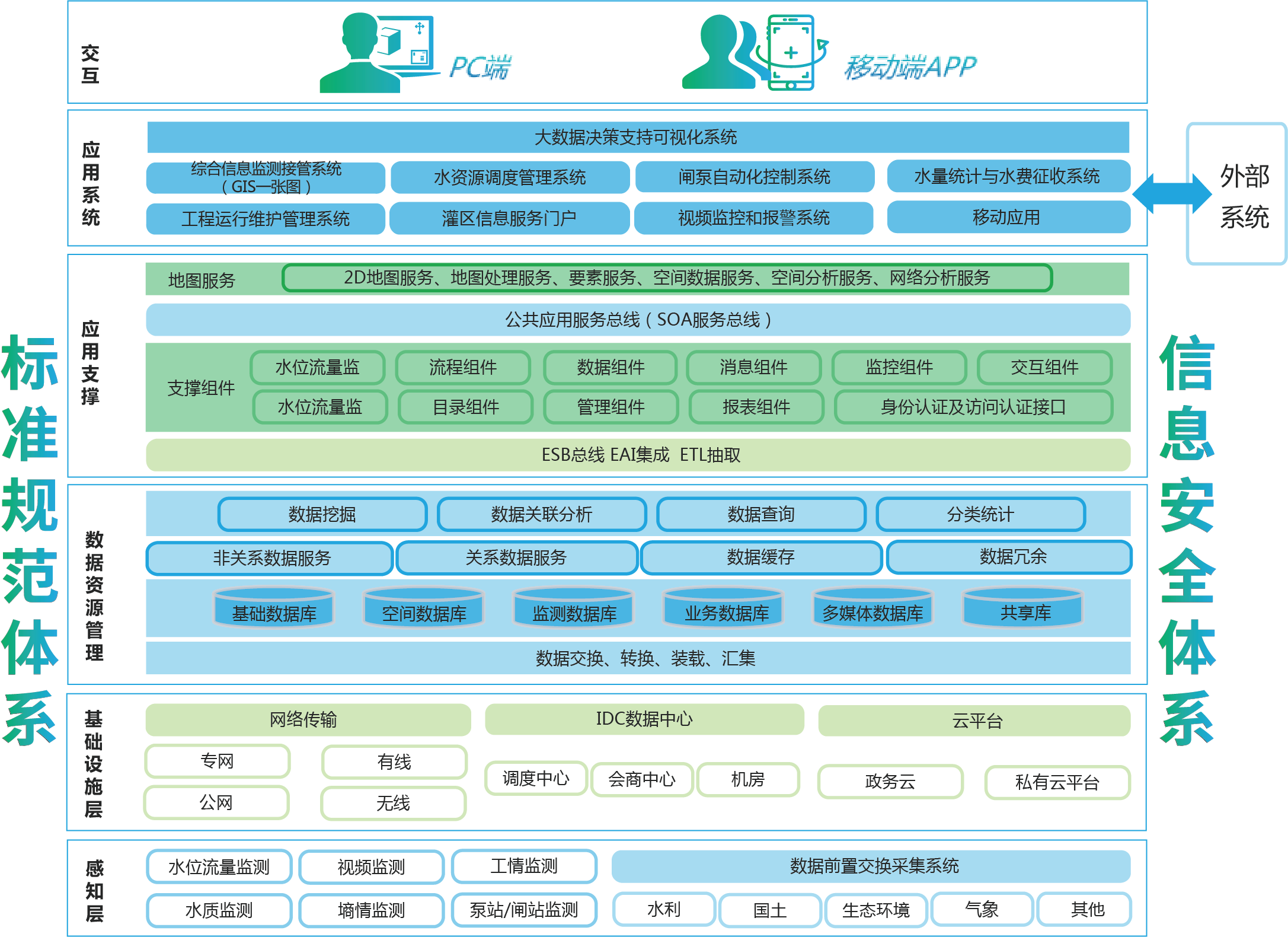 中水三立智慧灌區(qū)解決方案采用GIS、數(shù)據(jù)服務(wù)、調(diào)度模型等先進技術(shù),搭建信息化框架,建設(shè)以數(shù)據(jù)庫系統(tǒng)為支撐,以綜合信息管理服務(wù)、供配水調(diào)度管理、水費統(tǒng)計與計費征收、工程運行與維護管理、移動應(yīng)用等五個系統(tǒng)為主要內(nèi)容的信息化平臺。
