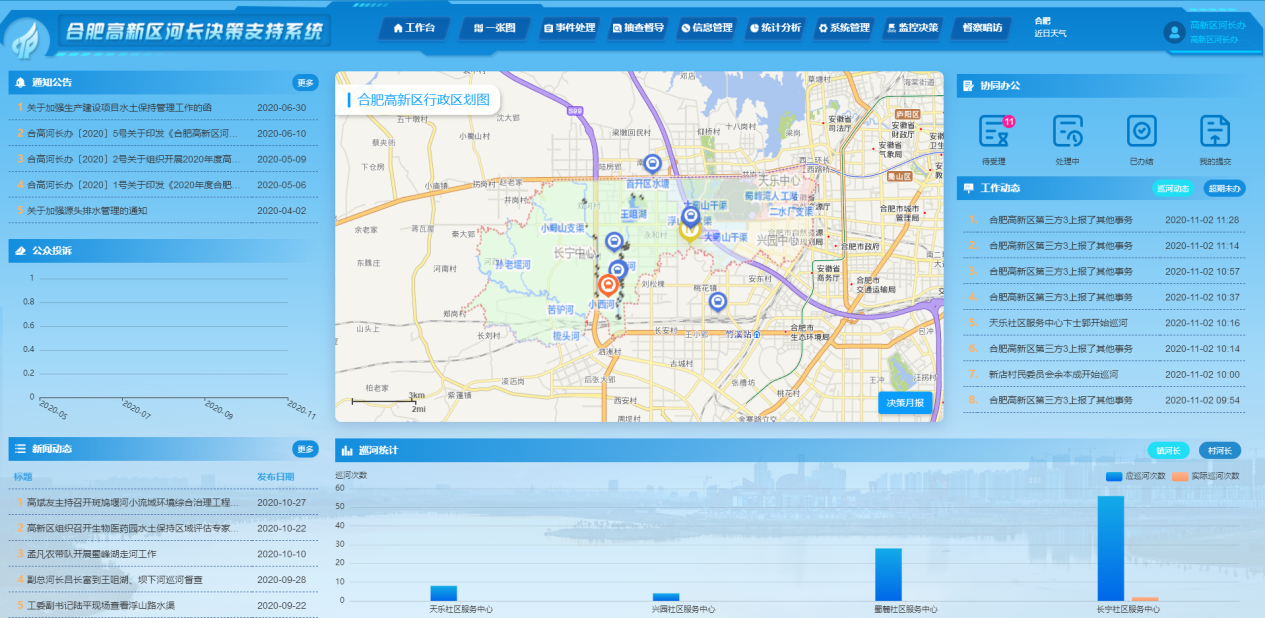 系統(tǒng)建成運行5個月以來,用戶體系覆蓋合肥市高新區(qū)各級河長、成員單位、河道警長100余人,巡河次數(shù)達(dá)8000余次,里程達(dá)1600多公里,巡河總時長12000多分鐘,上報事件187件,事件辦結(jié)率80%以上,接入零直排監(jiān)控、水域岸線監(jiān)控和水質(zhì)斷面監(jiān)測站點,獲取實時監(jiān)測數(shù)據(jù)約40000條。