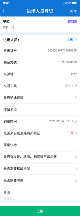 為保障工程進(jìn)度和返城復(fù)工人員生命財(cái)產(chǎn)安全,本次全新升級人員報(bào)到功能,包括支持人員信息上報(bào)關(guān)聯(lián)途徑中高風(fēng)險(xiǎn)地區(qū)、核酸檢測報(bào)告。另外考慮到復(fù)工人員素質(zhì)高低不一,支持專職人員進(jìn)行逐一、合并信息代為報(bào)到。