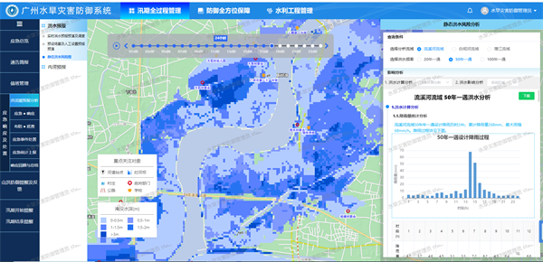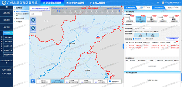 對(duì)廣州市白坭河、流溪河、增江流域1大12中水庫(kù)及9座攔河壩,開(kāi)展未來(lái)24小時(shí)工程調(diào)度推演,對(duì)工程調(diào)度水位、流量防洪安全限制及調(diào)度提供參考建議,為科學(xué)調(diào)度、降低下游洪水風(fēng)險(xiǎn)提供參考;對(duì)廣州市白坭河、流溪河、增江3大流域,實(shí)現(xiàn)未來(lái)24小時(shí)流域潛在洪水風(fēng)險(xiǎn)仿真預(yù)演,提供洪水淹沒(méi)范圍、淹沒(méi)深度和淹沒(méi)過(guò)程等直觀洪水災(zāi)害信息,為應(yīng)急人員調(diào)度和居民緊急轉(zhuǎn)移等應(yīng)急方案制定提供依據(jù)。