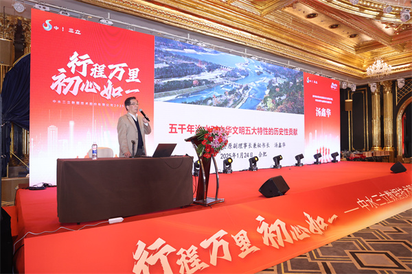 湯鑫華會(huì)長(zhǎng)則以其淵博的歷史學(xué)識(shí),帶來(lái)了《五千年治水對(duì)中華文明五大特性的歷史性貢獻(xiàn)》專題分享。他從宏大的歷史視角出發(fā),深刻揭示了治水活動(dòng)在中華文明形成、發(fā)展及繁榮過(guò)程中的歷史性貢獻(xiàn),展現(xiàn)了治水文化所蘊(yùn)含的深厚智慧與不竭動(dòng)力。湯會(huì)長(zhǎng)的分享不僅激發(fā)了現(xiàn)場(chǎng)嘉賓對(duì)治水文化的深刻共鳴,更為中水三立人傳承和弘揚(yáng)企業(yè)文化提供了寶貴的精神財(cái)富。