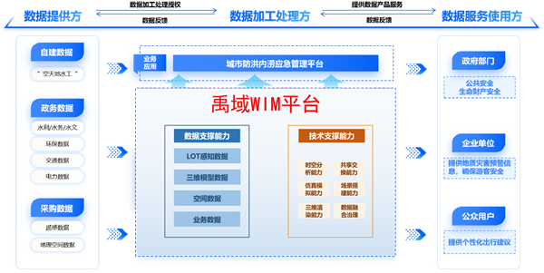 水利、氣象、環(huán)保、交通、電力等部門多源數(shù)據(jù)匯聚融合,通過禹域WIM平臺(tái),為城市防洪除澇應(yīng)急管理平臺(tái)提供數(shù)據(jù)支撐和技術(shù)支撐,實(shí)現(xiàn)平臺(tái)功能,服務(wù)于平臺(tái)用戶。